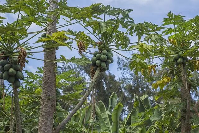 番木瓜看起来是树,能长到十米高,但实际上是一种大型的多年生草本植物。这种植物的茎通常不分枝,就这么直挺挺地长上去。如果茎顶断掉了,有时候也会勉为其难长几个侧枝,但一般都生长不良。叶片很大,掌状分裂成精致而复杂的形状,而脱落的叶柄在茎干上留下硕大的菱形叶痕。这些特征让你能一眼就把番木瓜树丛周围的植被中辨认出来,当然,如果开花结果了就更好认了。