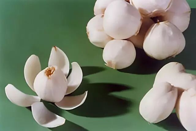 百合的可食用部位是鳞茎。鳞茎并不是真的茎,而是由肥厚的鳞片状叶组成的营养贮存器官,大蒜和洋葱头都是鳞茎。百合的名字就是由鳞茎的构成方式而来,李时珍说:“百合之根,以众瓣合成也,故名…其根如大蒜,其味如山薯,故俗称蒜脑薯。”如今人们常以百合花赠新婚夫妇,寓意“百年好合”,岂料是送错了部位。百合花只有六瓣,是要祝人家六年好合吗?