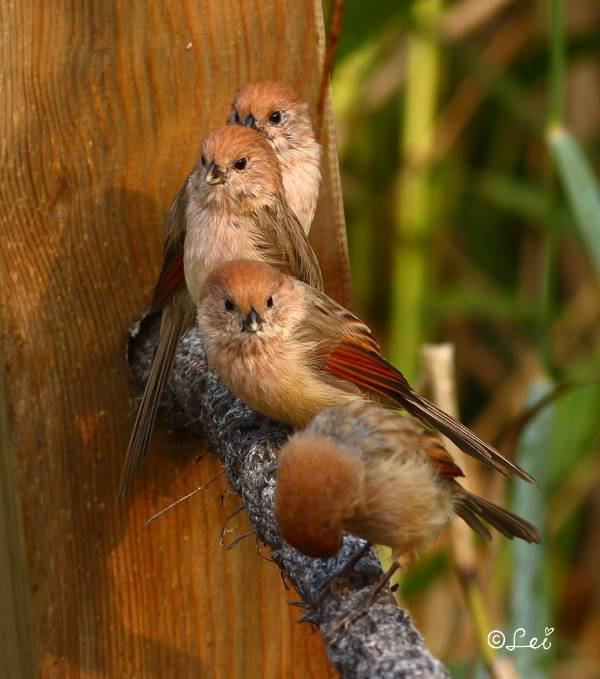 每年繁殖后期都能见到棕头鸦雀宝宝混在成年群里。这些羽色已经接近成鸟的小鸟非常容易分辨:你只要看有些尾羽明显短于正常长度,那十有八九就是宝宝了(当然也不能排除有那么几只成鸟在换羽)。尾羽如此短,使得它们更像一个个小鸟球——不过很快,它们就能和父母们飞得一样好,并且一样吵了。