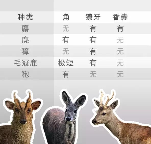 不要怕!獐、麂、麝三类动物,我们凭借獠牙、鹿角、香囊这三个最显要的特征就能分开。来看这个表(注意这个表是拿成年雄性的特征来列的):