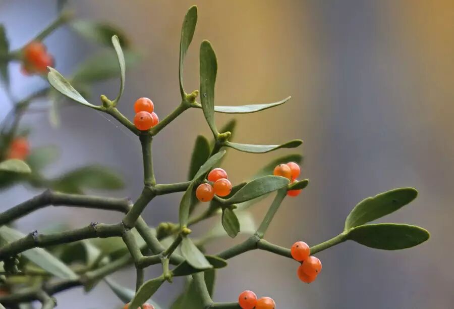 在英文语境里,mistletoe这个词是檀香目几乎所有半寄生植物的统称,涵盖了好几个科,比如槲寄生属(Viscum)过去所在的桑寄生科(Loranthaceae)和现在所属的檀香科(Santalaceae)。狭义的槲寄生指的是这个属里的几个常见种,比如唯一分布于欧洲的V. album和中国广布的V. coloratum。这些植物具有二歧或三歧分枝的茎干、对生或三枚轮生的长椭圆形革质叶片,与寄主的茎叶形态迥然不同,非常容易识别。尤其是秋天寄主落叶以后,常绿的槲寄生那团状的植株就暴露出来。