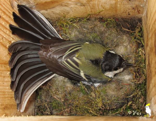大山雀是典型的洞巢鸟——它们会充分利用啄木鸟凿出来的树洞、天然树洞以及各种合适的墙洞、电线杆孔、石缝等地儿筑巢繁殖,而如果找不到合适的洞,它们也可以自己在树上凿洞,别看它这么小,喙的冲击力还是挺大的,咬人也很疼(别问我怎么知道的)。筑巢的时候它们会在洞内的空间铺上一层苔藓、羽毛和干草等组成的中间呈浅碗状凹陷的衬垫,在凹窝里产卵,每巢大约产卵8~14枚,偶尔还能生更多。它们也很喜欢人工巢箱,因此我们在瑞典做科研的时候时不时就会在巢箱里翻到一窝大山雀,被鸟妈妈恐吓一番(不过它们领域性极强,巢与巢之间通常距离较远)。
