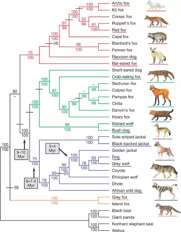 上面说的这三种犬科动物,代表着利用分子生物学划分出的犬科动物的三条主要支系: