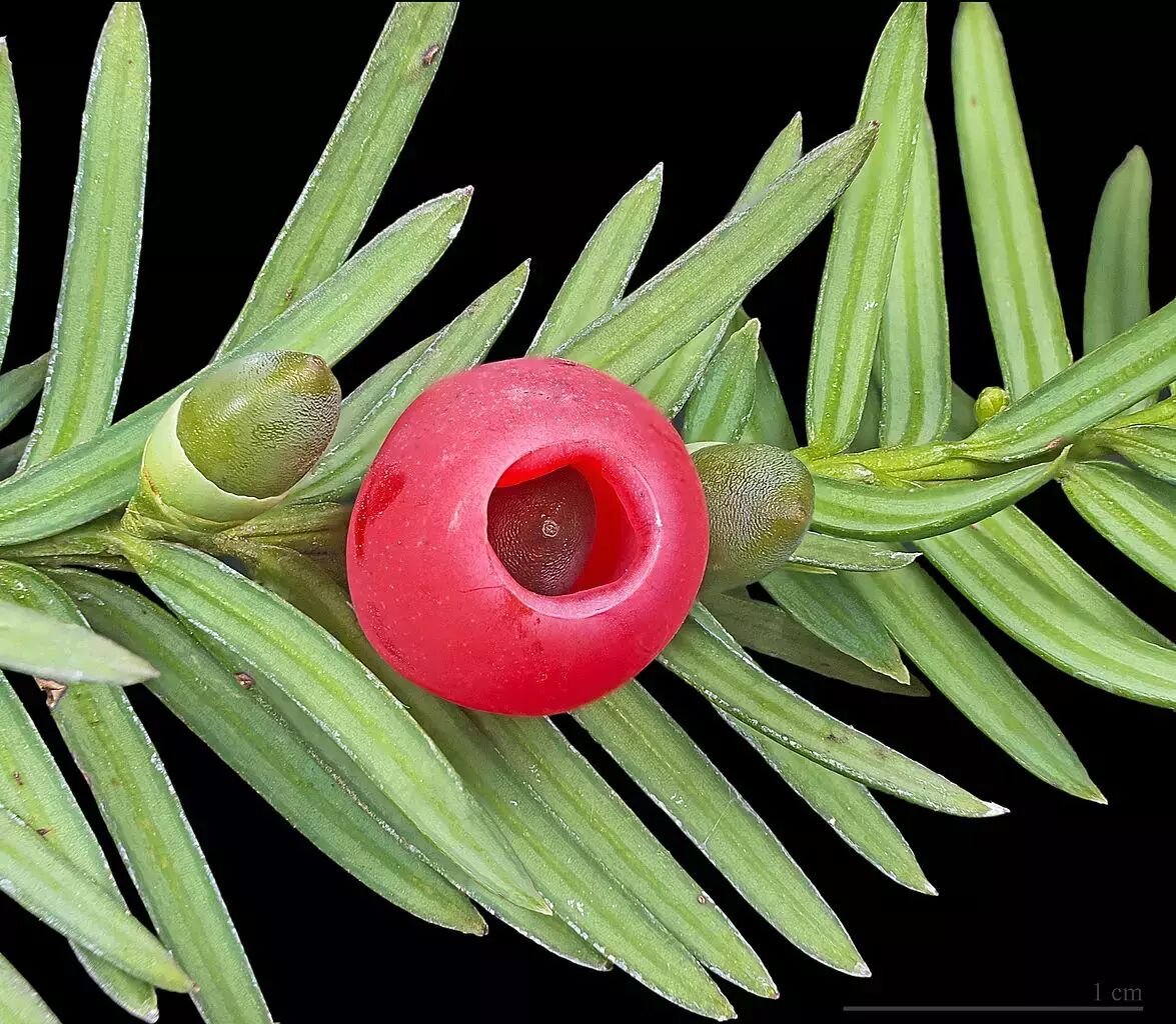 红豆杉最大的特色就是它们红红的肉质球果了。什么,长着这样浆果一样的球果,它还是裸子植物吗?说好的松塔呢?其实,松柏目植物的果实特化成浆果并非只此一例,此前就说过柏科圆柏(Juniperus chinensis)的球果长得就像浆果一样。