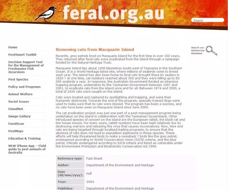 1880年前后,兔子的引入导致猫的大量繁殖,婴儿潮之后很多猫开始开发新的食物资源,比如麦夸里鹦鹉。