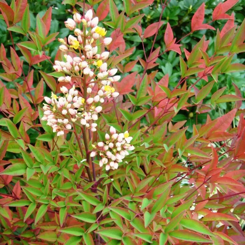 但是一旦开花,南天竹的“狐狸尾巴”就露出来了。虽然南天竹的花不大不鲜艳,但也比竹子的花高调不少——这些白色的小花直径大概是在六七毫米上下,有香气,聚在一起组成圆锥花序。而一旦果实成熟,南天竹结出的那一串串红彤彤的浆果更是让人无法与禾本科的颖果混淆起来。
