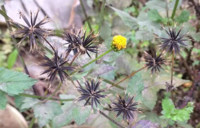 至于鬼针草的瘦果能黏在衣物毛发上,则是拜瘦果顶端生长出来的几根芒刺(其上有倒刺状刚毛)所赐,另外瘦果具芒刺也是整个鬼针草属植物的共有特征,所以也不是看到这样子的刺球就都是鬼针草啦,还是要注意看茎叶来区分(实在不会分辨那就还是踩死吧——虽然太粗壮不好踩死)。