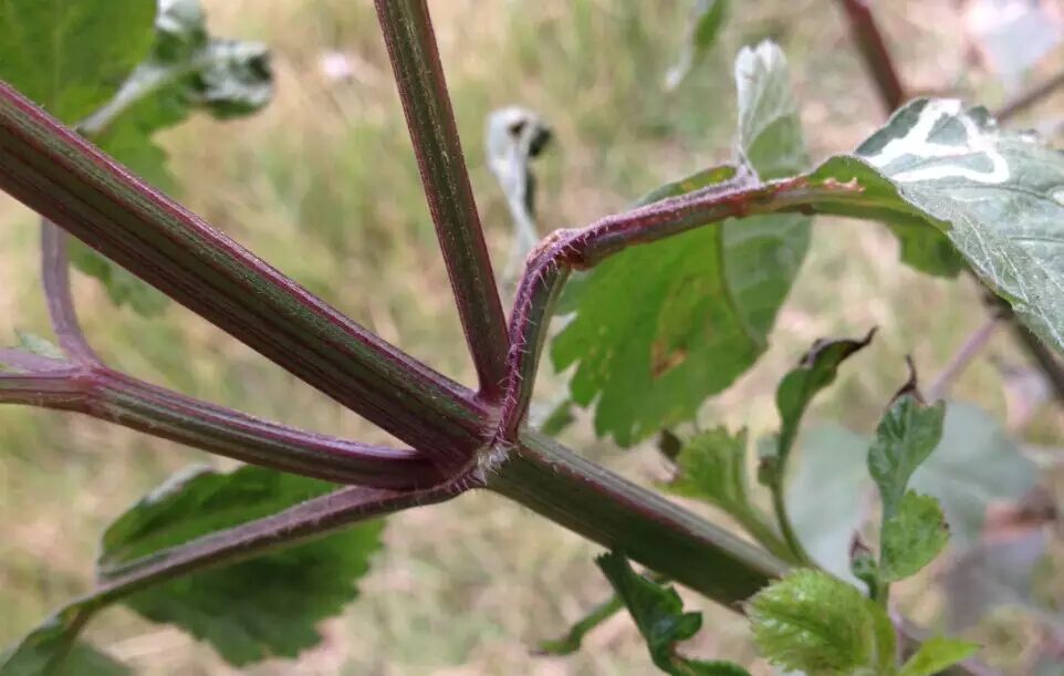 鬼针草 Bidens pilosa 被短柔毛的呈钝四棱形的茎和其上对生的枝叶,画面右侧的叶子上的白痕是潜叶昆虫的痕迹。(来源:自摄)