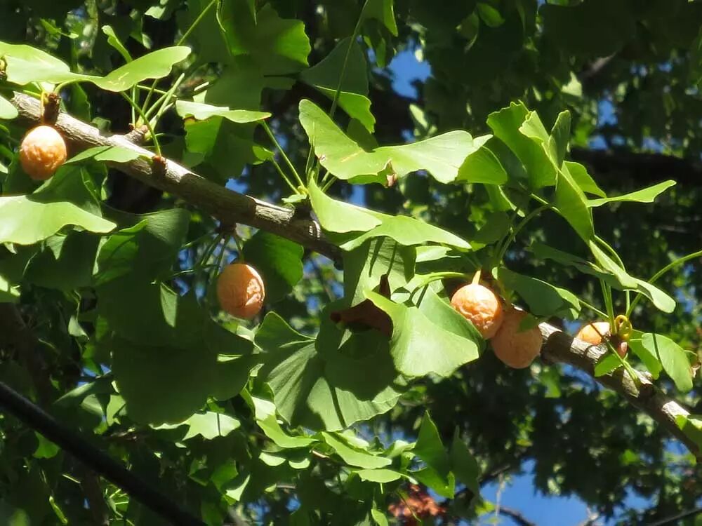 现在正是银杏种子成熟的季节。这种子有黄色肉质的外种皮,看起来像小一号的杏子;去掉外种皮后是银白色的骨质中种皮,这就是银杏和白果这两个名称的由来。然而银杏的外种皮并不像杏子那么甜美,它破损之后会散发出翔一般的恶臭,也许这是个赶走取食者保护种子的机制吧。然并卵,根本挡不住吃货好吗!不过每年秋天看到银杏树下施展十八般武艺的大妈大爷,我心里还是由衷敬佩的。