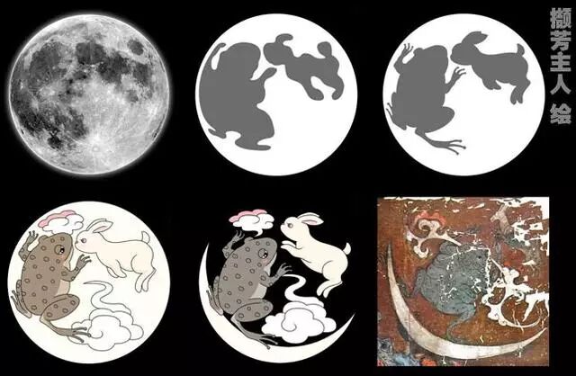 @撷芳主人 描画了一份月面的明暗轮廓图,经过美化,蟾蜍与兔子的形象跃然其上。图片来源:月亮上的“真相”