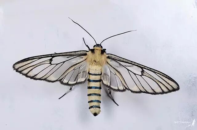 鹿蛾科(Ctenuchidae)也算比较常见的透明翅膀蛾子了,这个科大部分种类都是在翅上“开洞”。不过总有例外,透翅鹿蛾(Amata wilemani)就比较透彻。