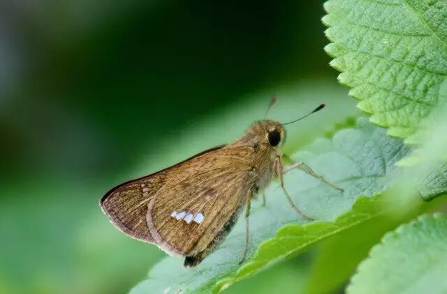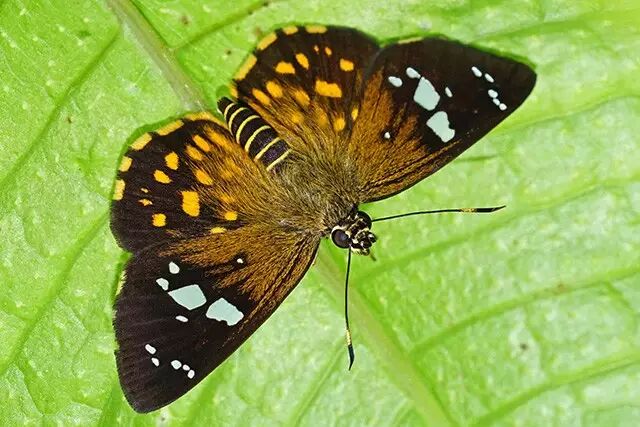 弄蝶科里有一些种类,翅上局部透明,但是太小了,不甚美观,只能算是破洞,唯一的长处是还比较对称,比如最常见的直纹稻弄蝶(Parnara guttata)。