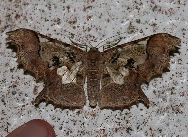 大窗钩蛾属的Macrauzata fenestraria,翅上的洞则开得又粗犷又随意。
