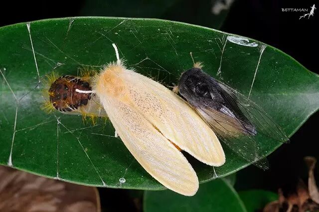 图中左边是榕透翅毒蛾的蛹,中间是雌体,右边是雄虫。图片:Shipher Wu