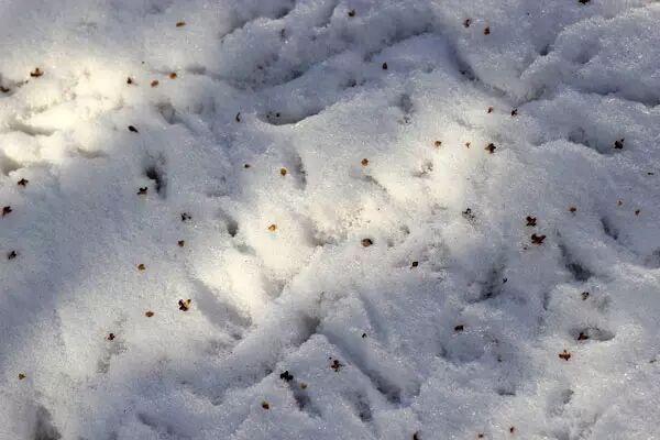 雪地上洒满了带薄翅的白桦树籽。白桦树种子是食谷雀们冬季的最爱,麻雀们站在树枝上一边吃一边掉,之后也会落下地面捡拾落地的树籽,把作案现场踩得一塌糊涂。