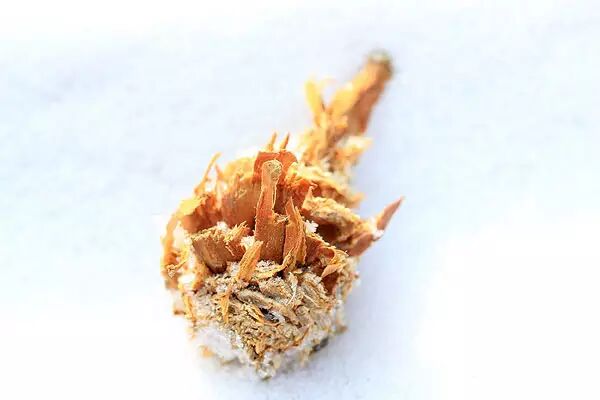 【落叶和积雪被胡乱刨开,旁边还有松鼠的坐痕——于是我们可以知道,小松鼠曾经坐在这里,努力地翻开雪层和枯叶,寻找之前储下的食物。】