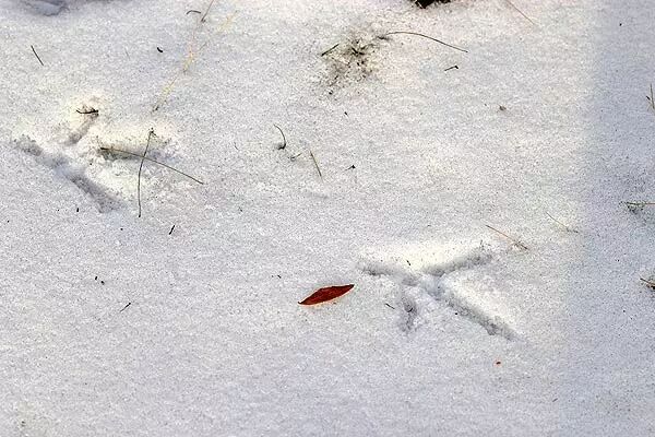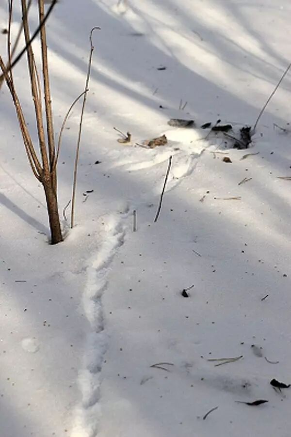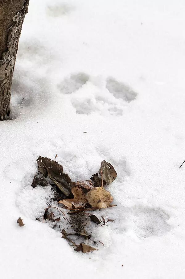 【如果在雪地上发现这样的足迹,那就可以知道,你走进了北松鼠的活动范围,也许足迹的主人正隐藏在高处偷偷观察你。】
