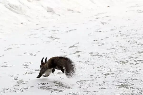【浅雪上跳跃的北松鼠。】