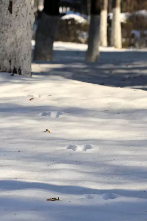 至于松鼠何时到此一游?足迹的新旧很容易辨认。松鼠蹦跳之时,刚留下的足迹边缘粗糙,旁边还会撒有一些弹起来的碎雪屑;若是已过多时,脚印则一定会被暖阳微微融化,边缘处格外圆滑平整。