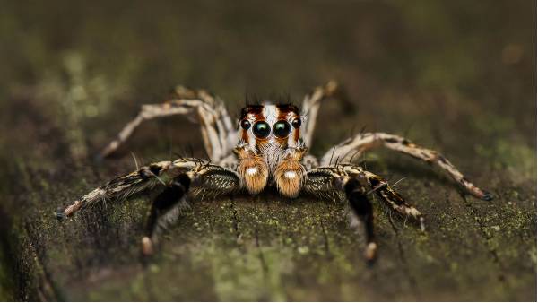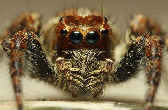 跳蛛科的眼列排成4-2-2,最前面一列4只眼,也就是我们跟跳蛛对视的时候看到的样子,中间两只最大的叫前中眼(AME),具有高达4种可吸收不同光谱的受体细胞,可以分辨4种颜色。旁边两只稍小的前侧眼(ALE)具有最好的视觉,分辨率很高,可以看清物体的细节,可以精确测量距离,在实验中,即使研究人员把跳蛛其他6只眼都蒙上,它仍然可以只靠两只前侧眼捕捉苍蝇。