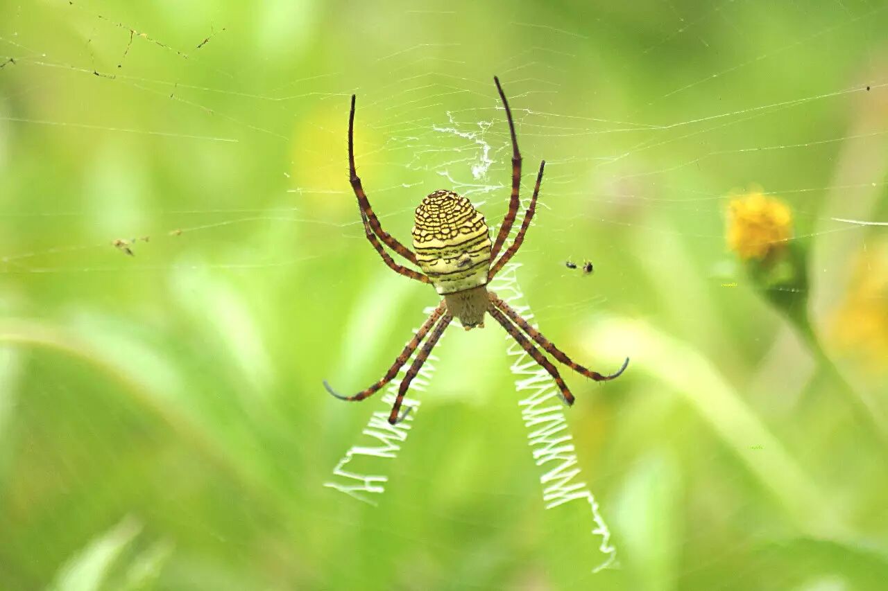 在华南和华东地区,经常可以在灌木林中看到看到一只金色的大蜘蛛端坐在一张大大的圆形蛛网中。看到这个景象,其实也用不着尖叫,同样也不用拿出手机拍照烦劳博物杂志,因为除过昨天介绍的棒络新妇外,大抵就是今天的主角——长圆金蛛(Argiope aemula)了。