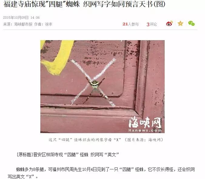 所谓的“天书蜘蛛”,其实是长圆金蛛的亲戚,悦目金蛛(A. amoena)。图片来源:http://fo.ifeng.com/a/20151009/41487437_0.shtml