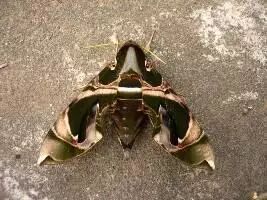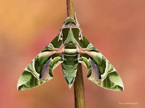 一个多月后,成虫就破土而出了。夹竹桃天蛾的成虫也算是天蛾科里比较漂亮的,花纹繁复。如何一眼鉴别出它呢?有两个特征:1.前翅基部有两个假眼斑,这倒和幼虫的眼斑有点呼应。2. 前翅中央有一条粉色的横带,与腹背的黄白色横斑于停栖时相连,看上去就像拦腰画了一条白腰带,所以它又名“粉绿白腰天蛾”。