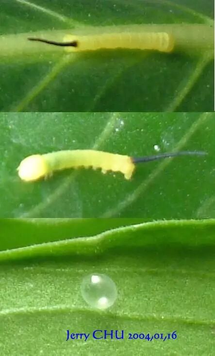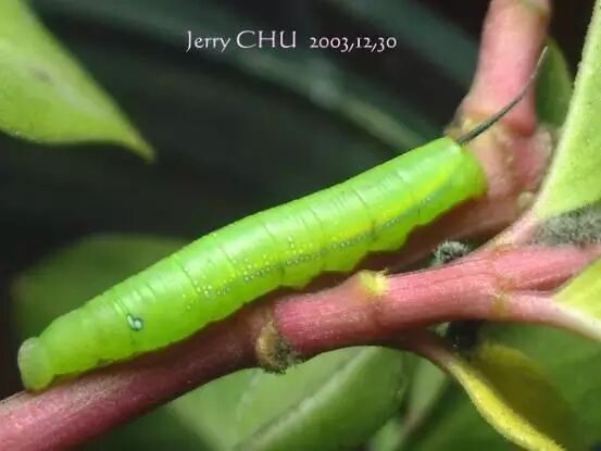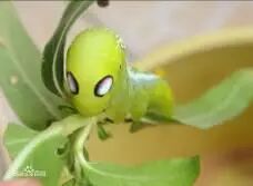 如果你对虫儿更感兴趣,不妨静待它孵化。孵化后的初龄幼虫全身碧绿,花纹不明显,臀棘特别发达,又长又黑。