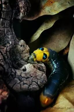 随着一次次蜕皮,它的臀棘慢慢变小,蓝色的“假眼”也越来越清晰——是的,这“钢铁侠”的眼睛其实并不是真正的眼睛,而只是胸部的两个斑点,受惊时,它就会鼓起胸部,显露假眼,让本是胸部的部位看起来像一个大脑袋,而真正的小小的头部已经缩进了胸部下面。至于它真正的眼睛,只是头壳上的几颗比芝麻还小的点点,基本属于摆设。