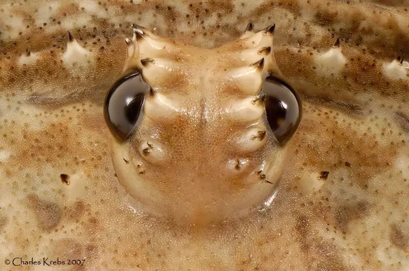 所以它们真的是“盲”蛛咯?并不是。有些洞穴盲蛛确实全瞎了,而剩下的大部分其实是有眼睛的,虽然不太容易被发现。跟蜘蛛妖冶的八(或六)只眼不同,盲蛛只有两只。这两只眼“站在”扁平的头胸部的制高点上,细看起来那是相当的萌。