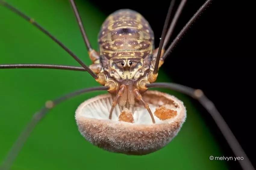 蜘蛛只能吸入流食,盲蛛则可以一口一口吞下食物。这也让它们比蜘蛛更容易感染寄生虫。没事儿的时候盲蛛经常会仔细用口器清洁腿部,那场景就很像——撸串。