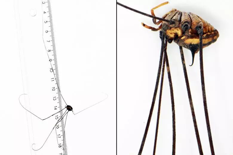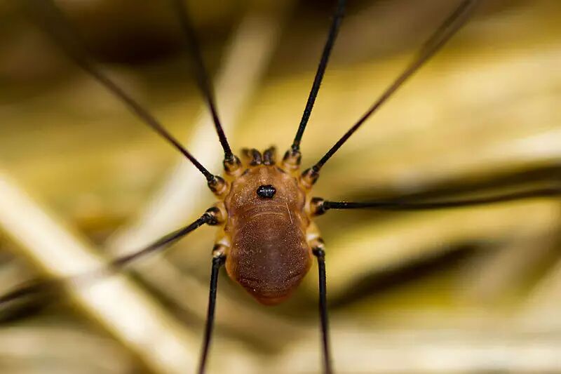 等等,八条腿?我来数数,明明不是嘛。确实,在野外八腿齐全的盲蛛并不算多,缺胳膊少腿是因为如果被捕食者盯上了,用一根腿换一条命还是值得的。脱落的腿还会继续抽搐几分钟,盖以诱敌。大部分盲蛛的第二对长腿尤其长,一边走它一边用第二对足探探探,充当导盲手杖。