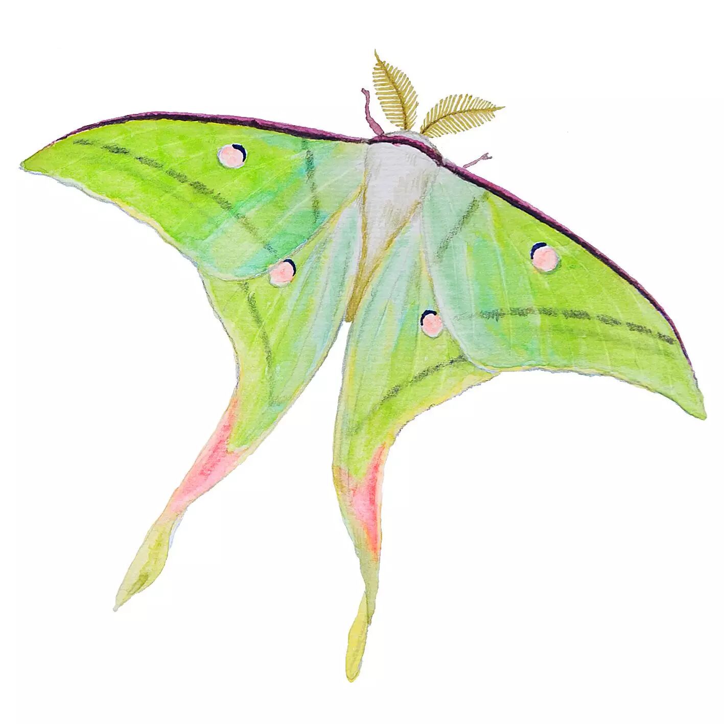 绿尾大蚕蛾Actias selene ningpoana,鳞翅目,大蚕蛾科,尾蚕蛾属,较大型的蛾类,翅展约120mm,翅粉绿色,前翅前缘紫红色,前后翅中室各有一黄褐相间的眼斑,后翅有较长的尾状突。华北区、华中区和华南区广布。寄主为柳树、樟树、枫香、火炬树等。
