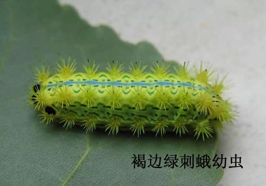 褐边绿刺蛾Parasa consocia,刺蛾科,绿刺蛾属,华北与华东地区较常见,是城市绿化植物的主要害虫之一。刺蛾科俗称洋辣子、毛辣子、凤辣子等等,如果不慎触碰到它们的幼虫,会非常酸爽。各种辣子有鲜艳的,有灰扑扑不起眼的,也有不怎么辣的,褐边绿刺蛾就属于较鲜艳的那一类。