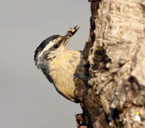 黑头鳾和普通鳾并非专一性食虫鸟类,它们在非繁殖期也会吃一些种子(比如第一张照片所示),还会把种子藏到树皮里(敲敲敲,种子就嵌进去了)作为冬季食物储备,到时候再啄出来吃掉。不过有那么多种子要藏,它们通常都不记得自己都把种子藏到哪里了,于是并不能有效地把它们找回来,只能找到哪个吃哪个了。