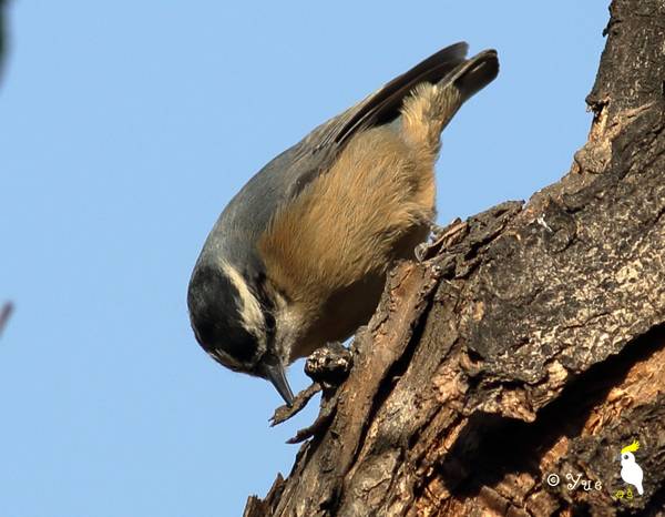 黑头鳾头朝下爬树的时候的招牌抬头姿势,叼着种子准备藏食儿(摄影:@红嘴蓝鹊 )