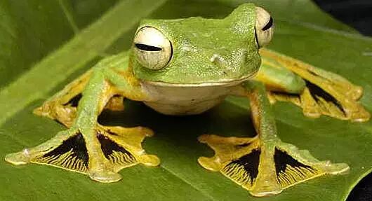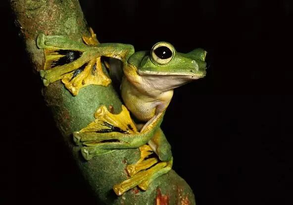 华莱士飞 ̶蛤̶蛙(Rhacophorus nigropalmatus)是苔藓蛙的一种,得名于它的发现者——生物学家阿尔弗雷德·华莱士(Alfred R. Wallace)。华莱士飞蛙生活在马来半岛的森林里,它的体型很大,体长有8到10厘米(雄蛙的体型比雌蛙小),除了交配和产卵,它们几乎从不下树, 而是利用脚趾间的蹼和体侧的皮肤在树枝间顺风滑翔(最远可达15米)来捕食昆虫。蹼还能帮助它们安全降落,还能用来爬树。飞蛙的天敌主要是树蛇(常在树上走,哪能不……)