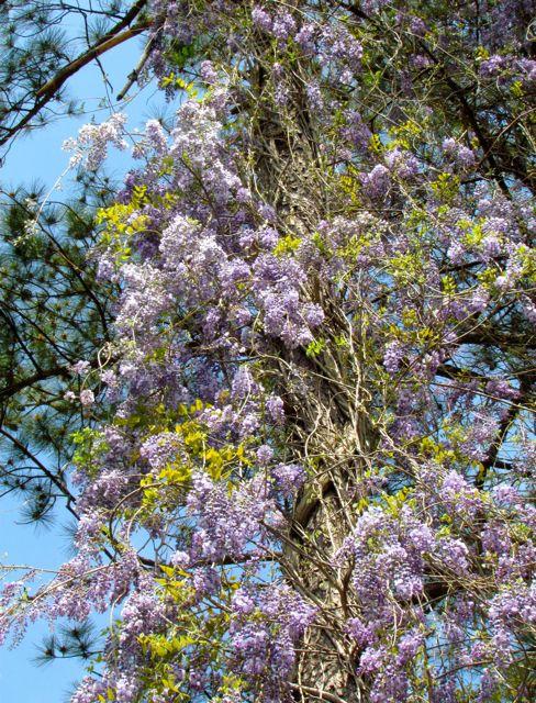 盛花中的紫藤正在绞杀一棵松树。图片来源:piedmontgardener.files.wordpress.com