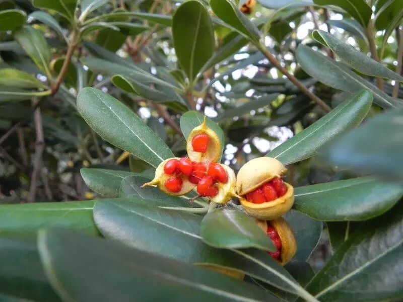 再过几个月,海桐的果实就成熟了,每年五月到十月,我们都不难找到海桐的果实。这些果实圆圆的,顶上有一个小尖,刚开始是绿色,成熟后会变成黄褐色、木质,然后裂开三瓣,露出里面鲜红色的种子。每个果荚里有种子多枚,因为相互挤压,表面都是多边形的——像石榴子那样。这些红红的种子十分黏,可以黏在一些小动物身上,被传播到更远的地方。