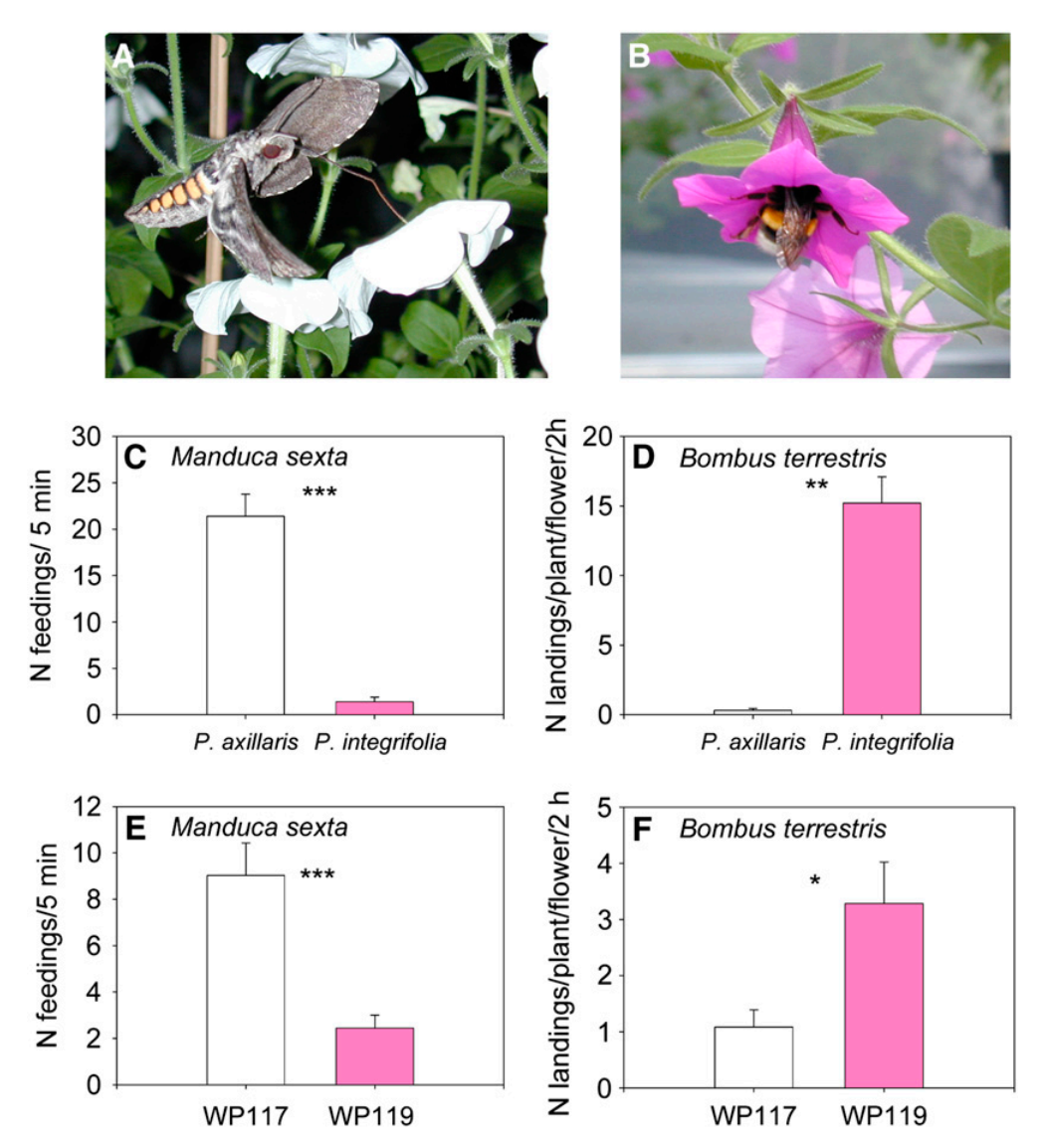 P. axillaris和P. integrifolia的天然传粉者,以及后者的颜色突变个体对传粉昆虫的吸引力变化,图来自Hoballah et al,2007。