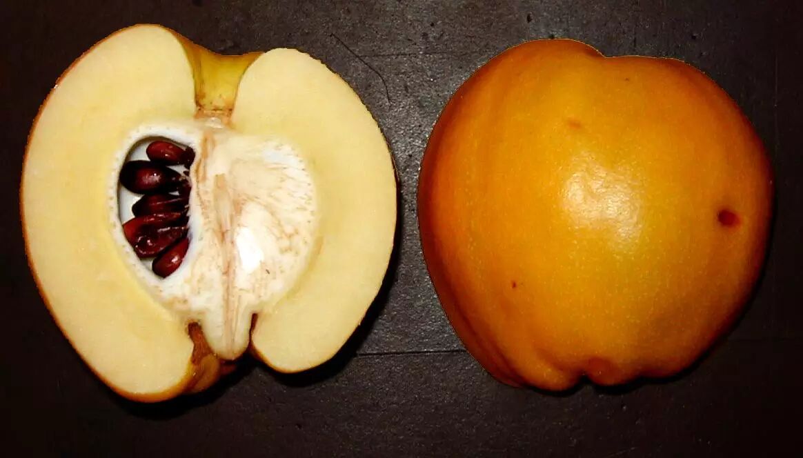 皱皮木瓜某个栽培品种的成熟果实纵切,结构类似苹果,而且并不会裂开。图来自wiki。