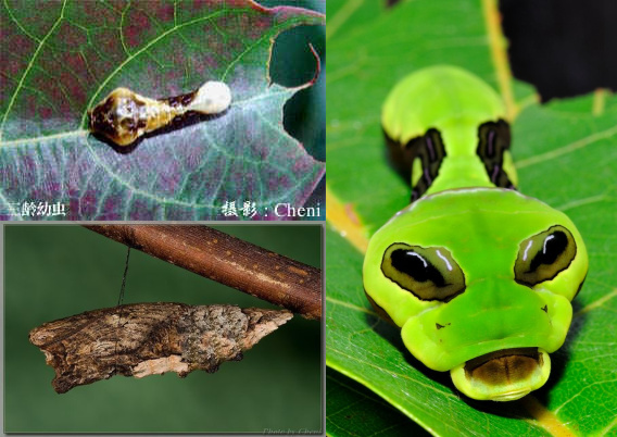左上:宽尾凤蝶的三龄幼虫。右:宽尾凤蝶的五龄幼虫。左下:宽尾凤蝶的蛹。图/ntnu.edu.tw & cheni61/blog.163