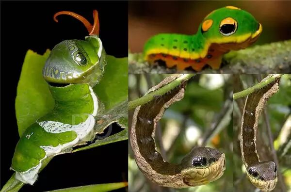 左:柑橘凤蝶的幼虫伸出了丫状腺。右上:一种凤蝶幼虫伪装成的“萌”蛇。右下:一种天蛾幼虫,专门模拟的是颊窝类毒蛇,把颊窝都模拟出来了,不可谓不敬业。