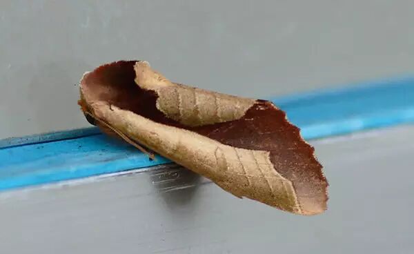 不过,最神奇的其实要数核桃美舟蛾(Uropyia meticulodina)。这种蛾子并不罕见,在北京山区就能见到。它的特别之处在于,完全通过不同颜色鳞粉的排列,就能使平面的前翅变成一个卷曲的枯叶!