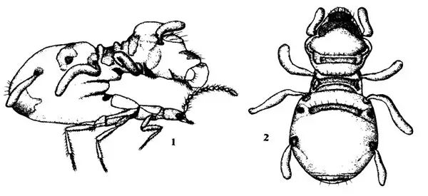 为了在白蚁窝里骗吃骗喝,隐翅甲只好忍辱负重,左右分别为隐翅甲的侧面观和背面观。