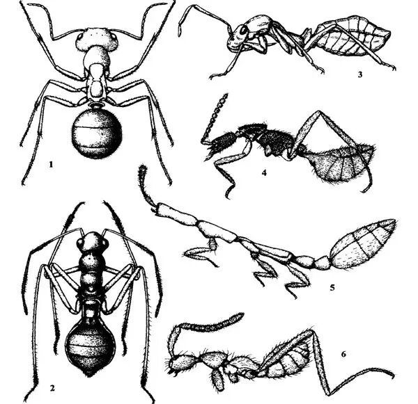 1.蚂蚁 2.一种盲蝽 3.一种半翅目昆虫 4、5、6.隐翅甲