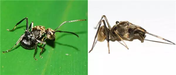 有些蚁蛛会专门模仿某一种蚂蚁。左为台湾的一种多刺蚁,右为与其生活在同一生境的蚁蛛。摄/张辰亮