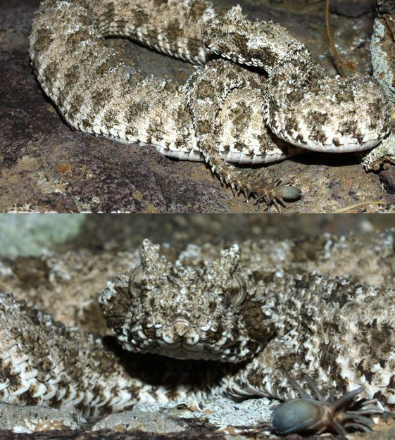 响尾蛇则会摇动尾部,发出类似水流的声音,吸引小动物。2006年刚发现的新种蛇——蛛尾拟角蝰更为诡异:它的尾端变成了蜘蛛或昆虫的样子,而身体拟态覆盖了地衣的石块。身体不动,尾端轻轻摇动,小动物只看到了美味的“蜘蛛”,而忽视了后面的“石头”,猎物自然手到擒来。