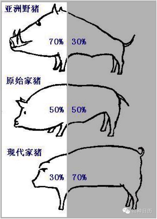 在由野猪向猪的变迁过程中,猪的生物学特性发生了如下的继承和变化: