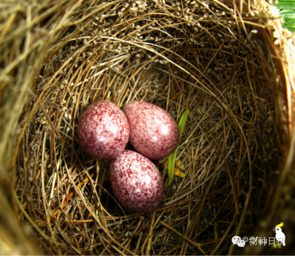 白头鹎一年繁殖1~2窝,北方较冷繁殖较晚,一般都是一窝,南方多两窝。一窝2~6枚卵。在南方主要是在树上筑巢,北方则主要是灌木里筑巢,巢为草编的碗状编织巢。筑巢是由雌鸟独立完成的,雄鸟则全程跟着,在旁边警卫。孵卵也是雌鸟独立完成,雄鸟也在附近守卫(其实真要是来了灰喜鹊偷吃鸟蛋,雄鸟就跑了)。小小的卵上密布着紫红色的斑点。很多鸟的卵都是有斑点的,不过也有很多是纯色的。我曾做过白头鹎繁殖的科研项目(指导教师@红嘴蓝鹊 ),因而有幸拍到过它的卵和鸟宝宝们(非科研目的还请不要打扰鸟儿们的繁殖,很多时候会让鸟儿们觉得筑巢的地方已经不安全了,会抛弃巢和卵,严重的甚至抛弃鸟宝宝)。
